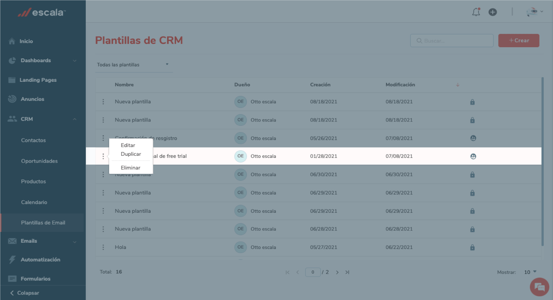 4.1 Para editar una plantilla, haz clic en los tres puntos que están al lado izquierdo del nombre y selecciona Editar. Además, también puedes elegir entre las opciones Duplicar o Eliminar.