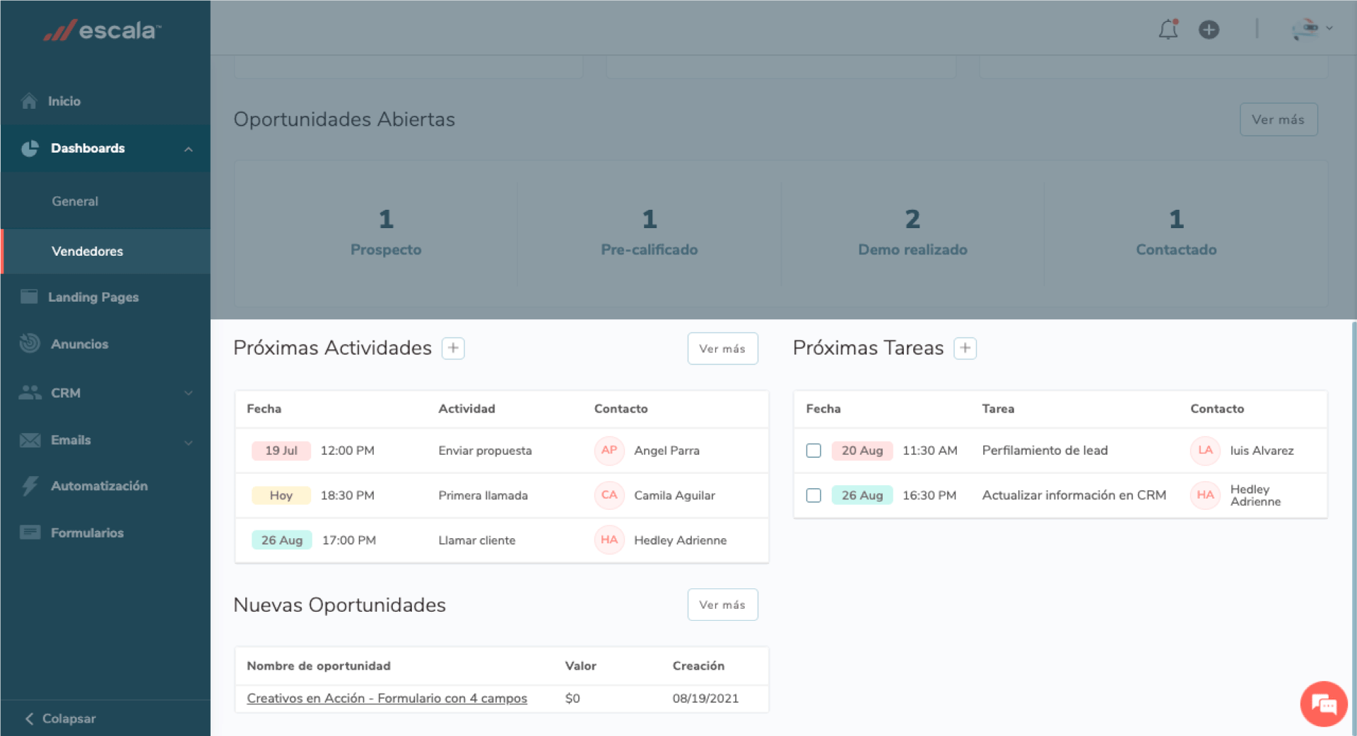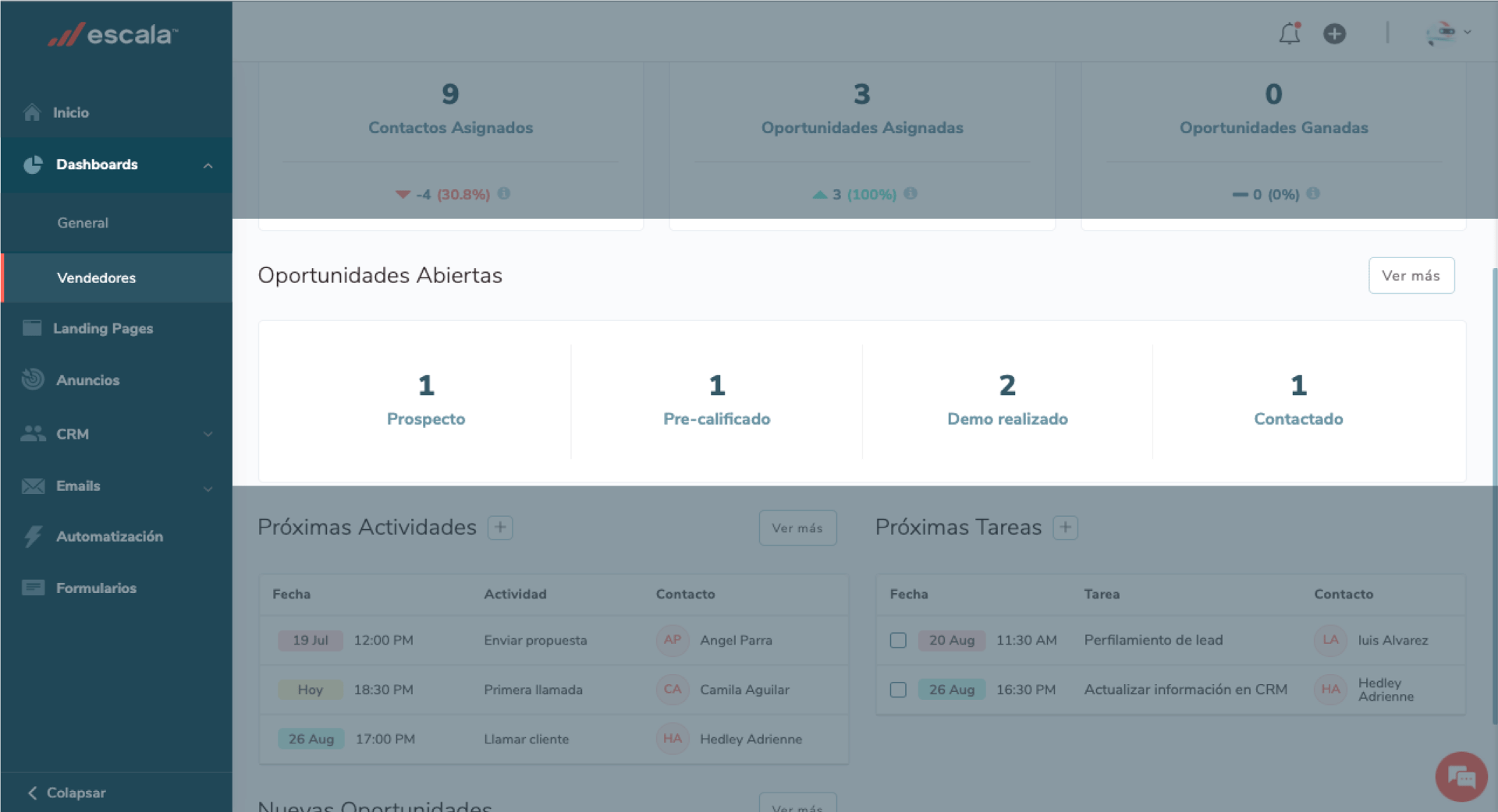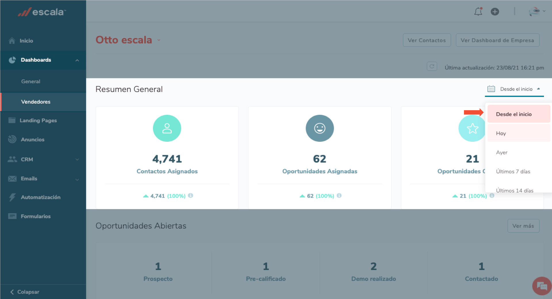Usuarios autorizados: Administradores. La misión: Visualiza el dashboard general con estas 4 acciones. Visualiza el resumen general de contactos y oportunidades 1. El dashboard general de Escala te muestra un resumen de las cifras más importantes de ...