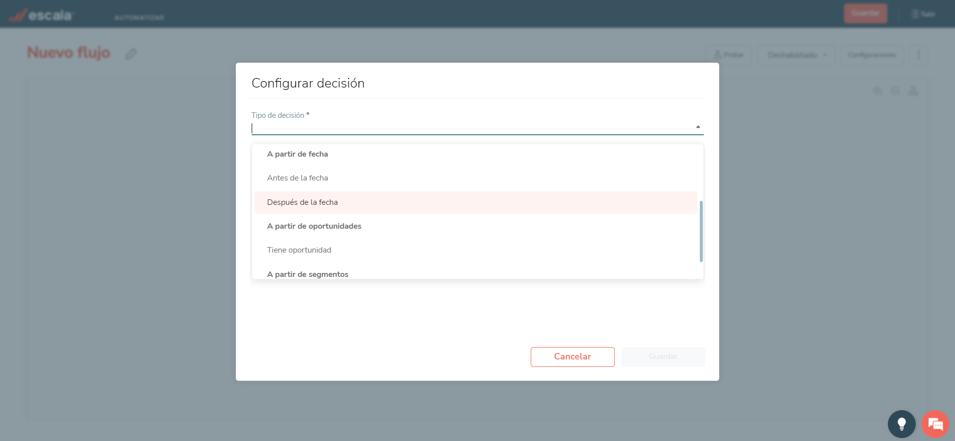 En Escala, puedes crear flujos automatizados a煤n m谩s precisos haciendo uso de las bifurcaciones. Estas son divisiones condicionales que te permiten personalizar los flujos seg煤n el comportamiento de los contactos que pasen por el mismo. Cada divisi贸n en el flujo se denomina Decisi贸n, y se clasifican a partir de 4 escenarios puntuales en la plataforma: