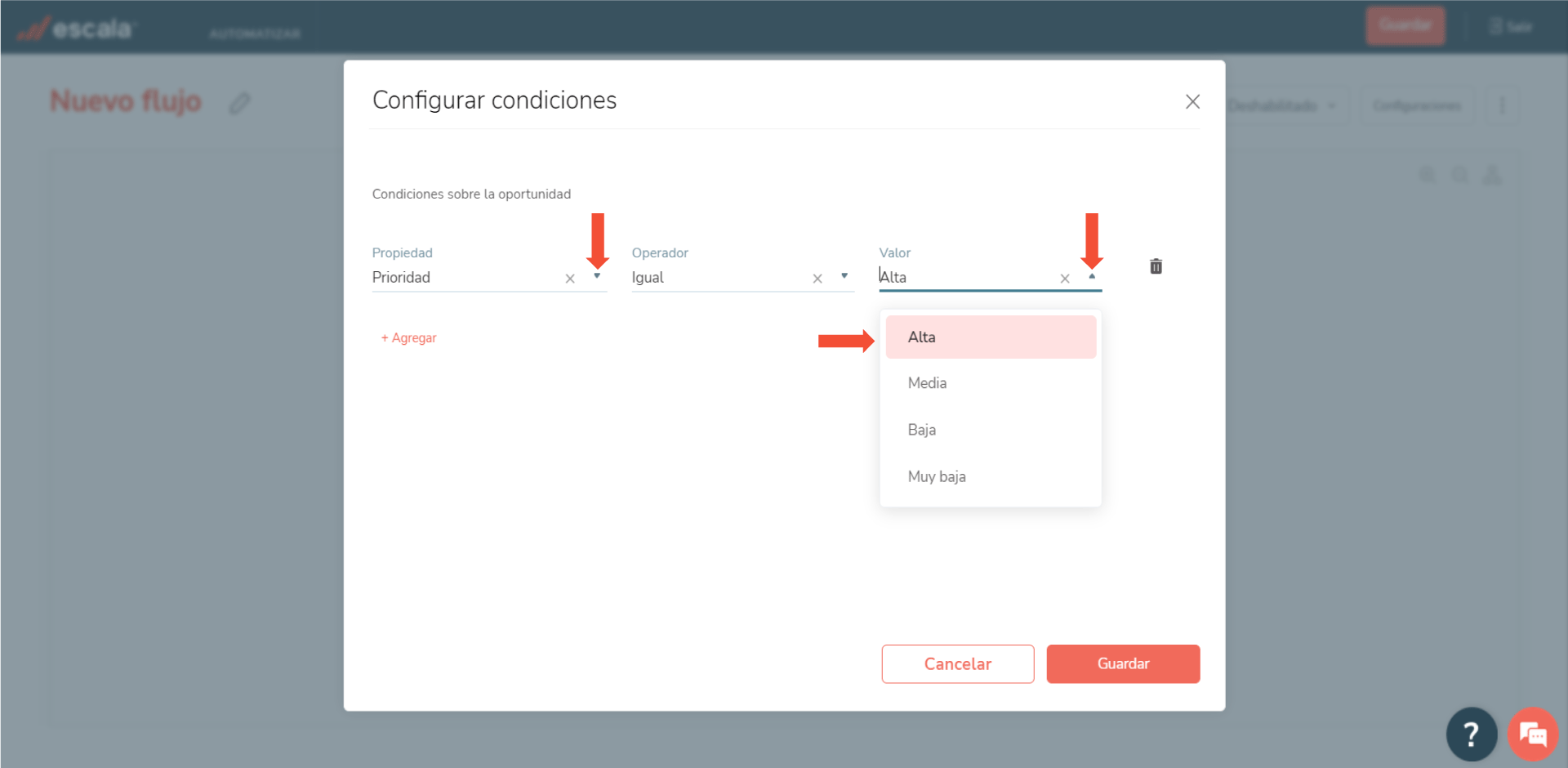2.2 En la ventana emergente haz clic en Agregar y, en el listado Propiedad, elige la información de la oportunidad que deseas configurar como condición para que se active el flujo. Por ejemplo, puedes elegir la condición Prioridad y en el campo de Valor, especificar si quieres que el flujo se active cuando la oportunidad sea de prioridad alta, media, baja o muy baja. En este caso, seleccionamos la opción de prioridad Alta.