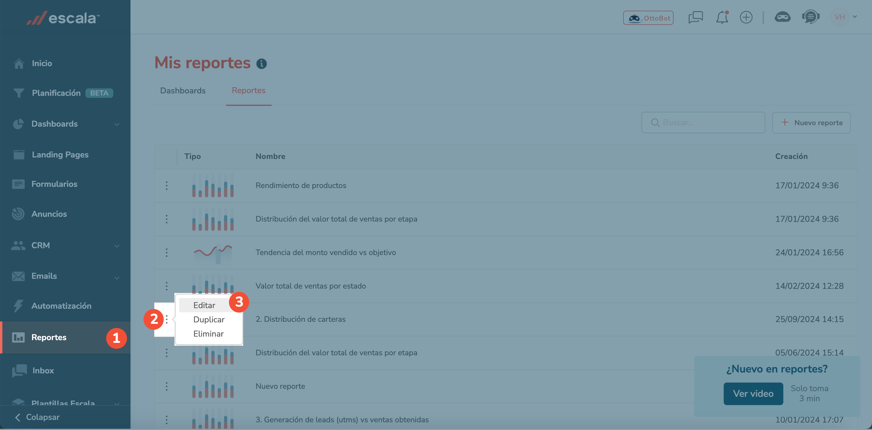 1. Para editar un reporte desde tu panel, presiona los tres puntos en la esquina superior derecha de la tarjeta correspondiente al reporte y elige la opción Editar.2. Luego, se abrirá el reporte directamente desde el constructor de reportes, donde podrás modificar todos los aspectos que desees. Recuerda hacer clic en Aplicar y Confirmar para que se guarden los cambios.3. Al culminar, haz clic en Guardar y, después, en Salir.4. Al salir, Escala te llevará a la vista de ese reporte. Para volver al panel que tenías abierto, debes regresar a este apartado y volver a abrirlo para continuar revisando y personalizándolo tanto como quieras.