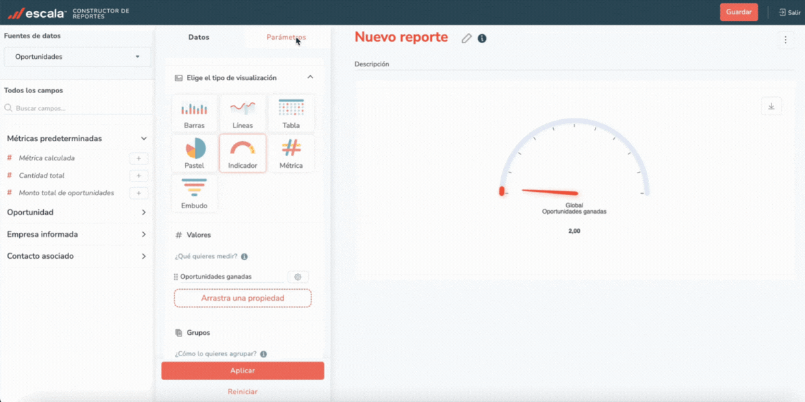 1. Crea un nuevo indicador, por ejemplo, con la métrica Cantidad total de oportunidades y cámbiale el nombre a "Oportunidades ganadas - Enero 2025".