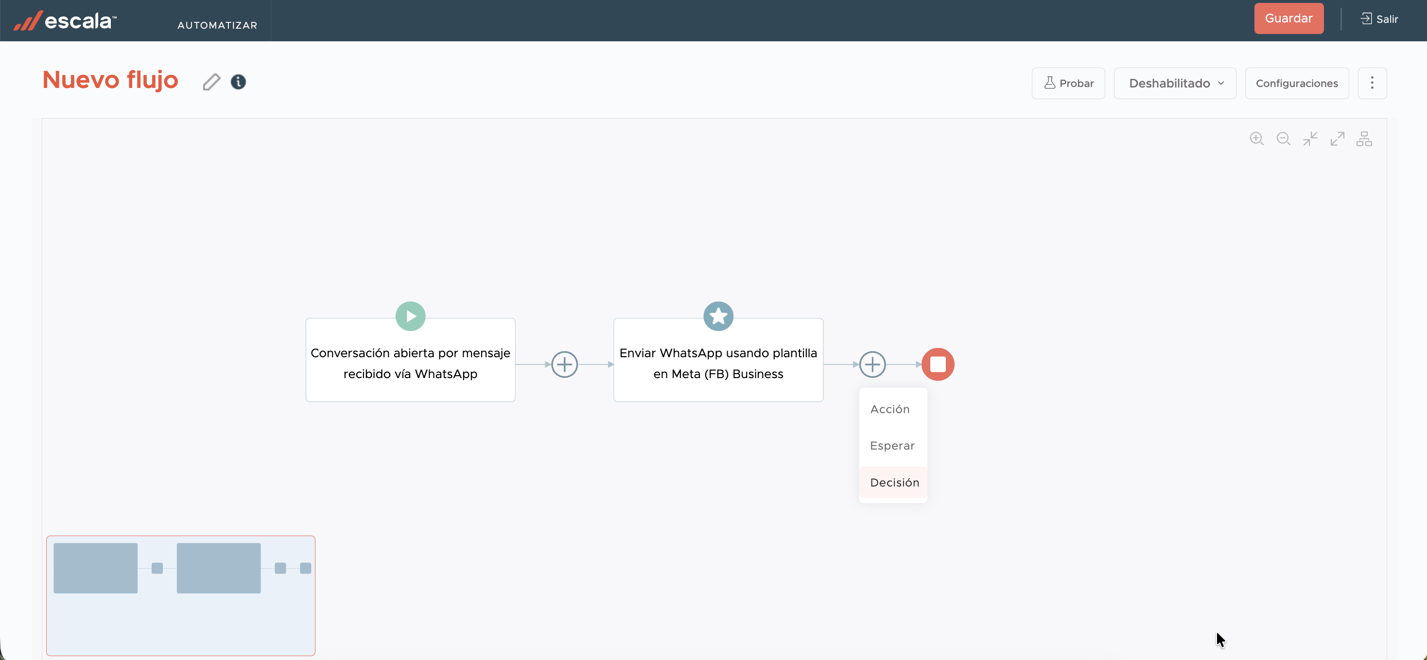 1. A partir de dicha acción, puedes elegir si agregar otra acción o una decisión. Para configurar distintas opciones a partir de una plantilla de WhatsApp enviada, selecciona la opción Decisión.