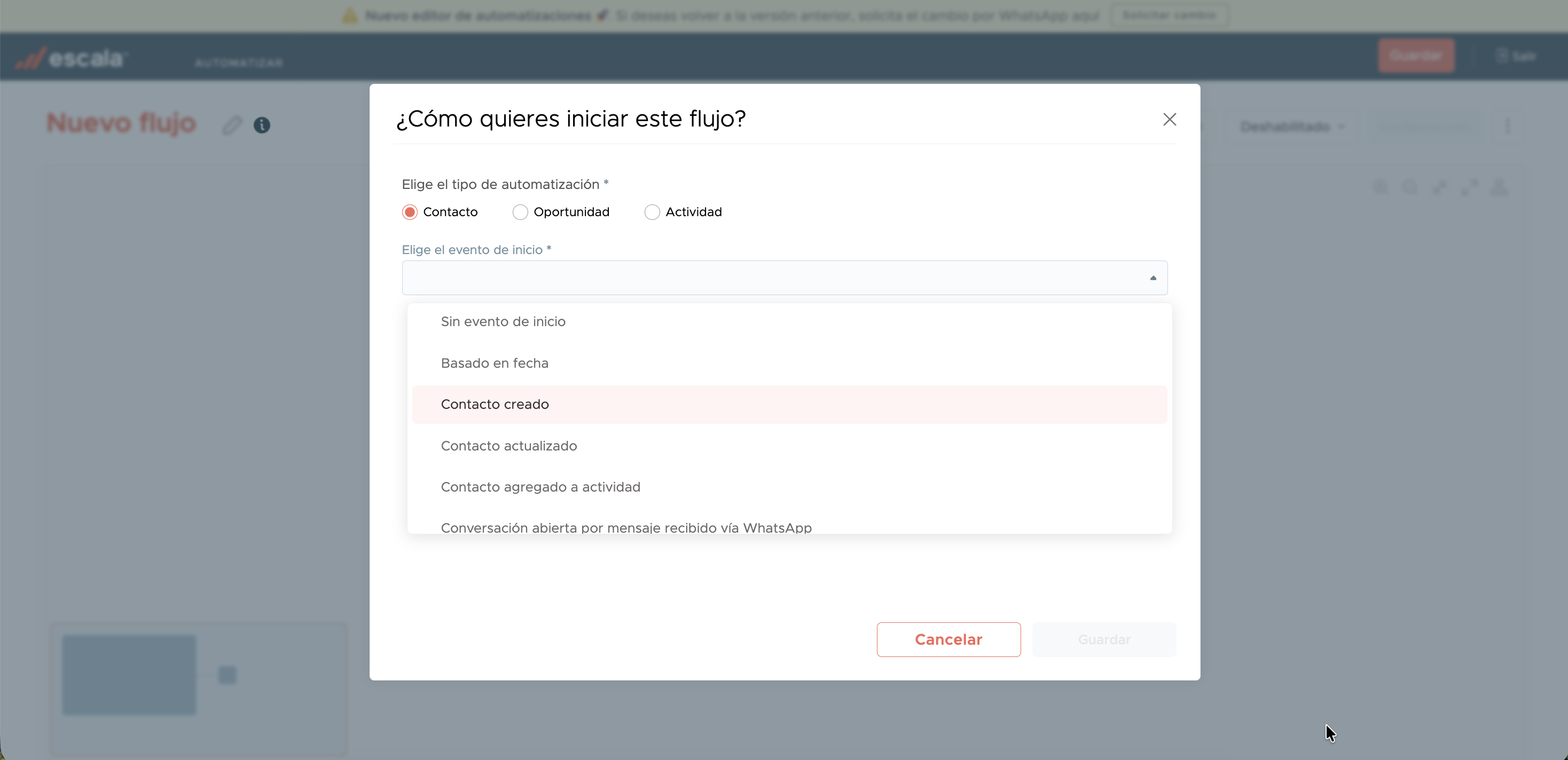 1. Dirígete a Automatización > Crear > Crear desde cero.2. Elige la entidad principal de tu flujo, que en este caso debe ser de Contacto.3 Luego, elige el evento de inicio para este flujo en la lista de opciones que se desplegarán en esta ventana y, por último, haz clic en Guardar.