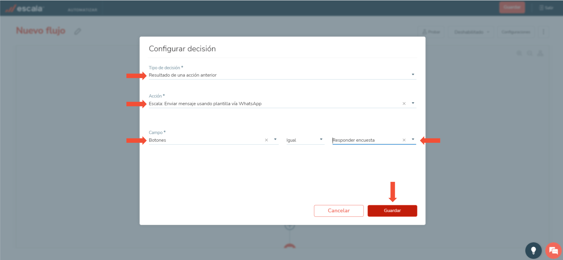2. Luego, elige el Tipo de decisión, que en este caso será el Resultado de una acción anterior, donde podrás especificar la acción y las opciones correspondientes para que se realice la bifurcación. Por último, haz clic en Guardar.