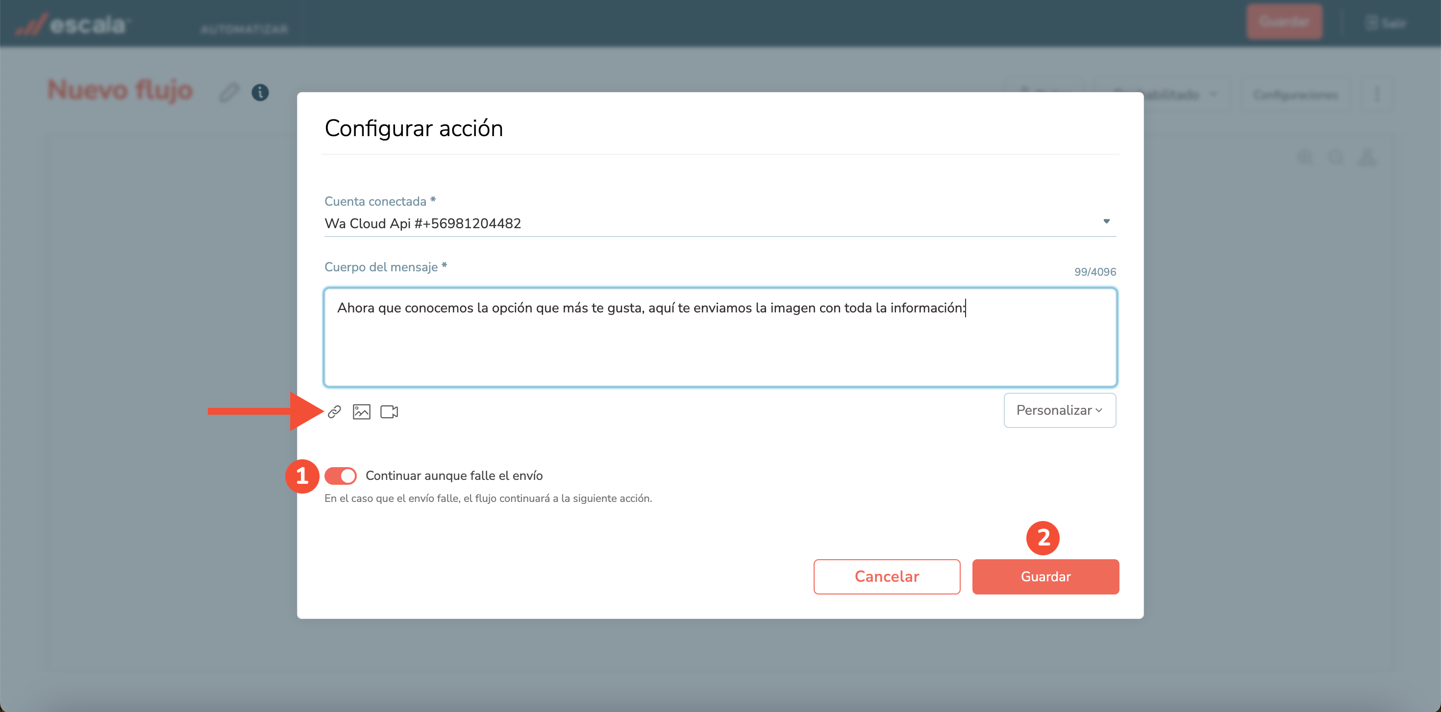 6. Después, debes establecer el Tiempo de espera por la respuesta, que puede ser de máximo un día y mínimo de 1 minuto. Este será el tiempo que se esperará para que el contacto continúe hacia la siguiente acción del flujo.7. Por último, marca la opción Continuar aunque falle el envío en caso de que el contacto creado no posea un número telefónico asociado a WhatsApp o haya un error en el dato brindado. Luego haz clic en Guardar.
