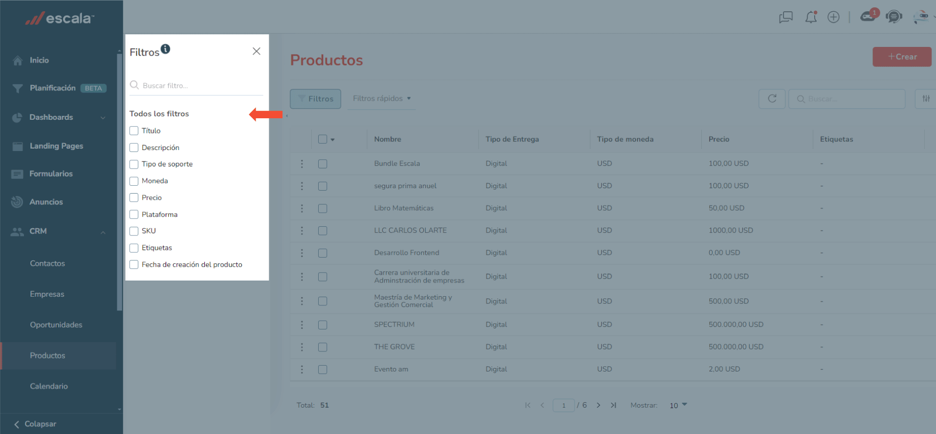 Filtrar productos en el CRM