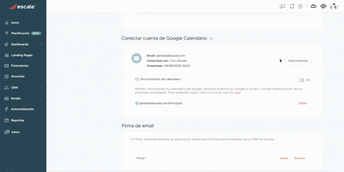 - Conexión de calendarios: Se puede conectar solo un (1) calendario, y el usuario de Escala debe coincidir con el de Google, es decir, se debe usar el mismo email.