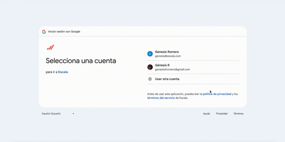Se puede conectar solo un (1) calendario a Escala, y por defecto es el calendario principal de Google. Durante el proceso de conexión, el usuario debe seleccionar la cuenta de Google correcta, que coincida con el mismo usuario de Escala.