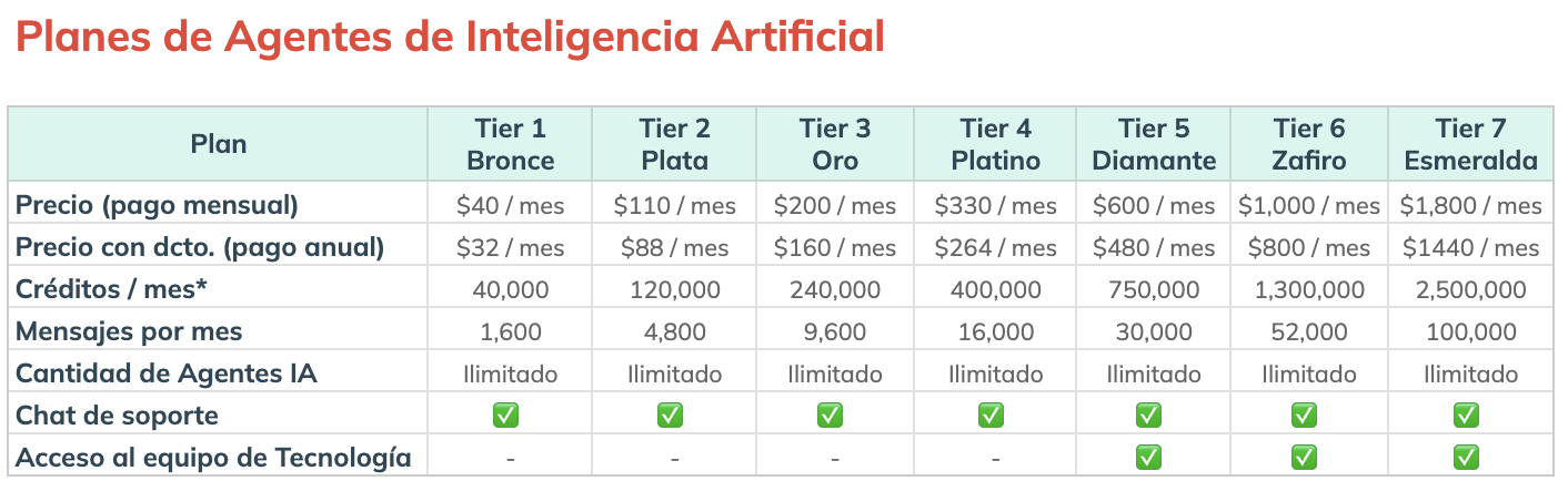 - Suscribirte a un "Tier" o Plan de IA: Esta es la forma recomendada para usuarios que planean usar los Agentes de IA de forma regular. Al suscribirte a un plan específico de IA, obtendrás una asignación mensual de "Créditos del Plan IA".