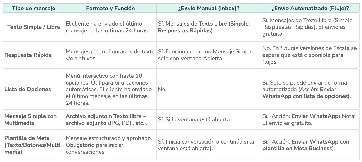 Los mensajes se clasifican seg煤n su prop贸sito y formato, y est谩n disponibles tanto para cuentas conectadas de WhatsApp Business App como WhatsaApp API. El m茅todo de env铆o (manual vs. automatizado) define si se pueden usar en Escala.