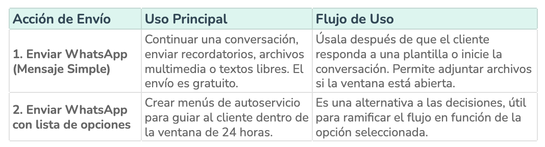 La clave de la automatizaci贸n de comunicaciones de WhatsApp en Escala es combinar las Acciones de Env铆o con la Decisi贸n Resultado de una acci贸n anterior para crear bifurcaciones: