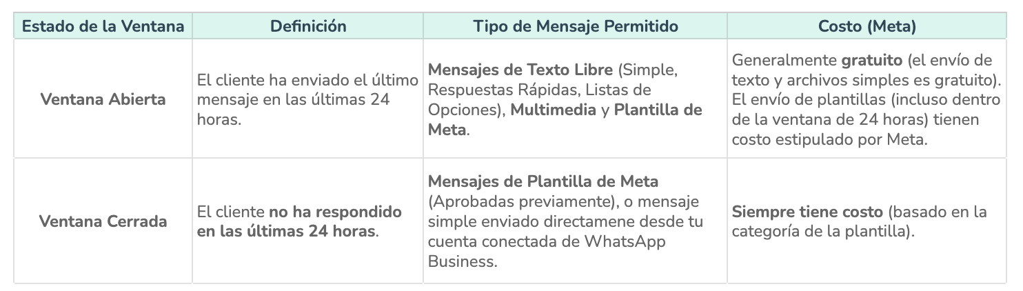 El tipo de mensaje que puedes enviar y la forma de facturaci贸n de Meta dependen del estado de la conversaci贸n con el contacto, es decir, si la ventana est谩 abierta o cerrada.